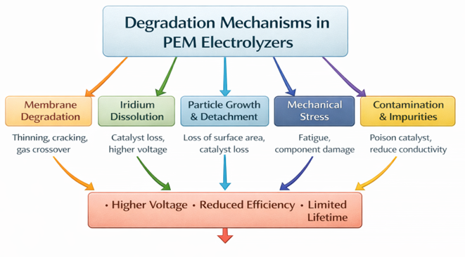 - Was sind die wichtigsten Degradationsmechanismen in PEM-Elektrolyseuren?